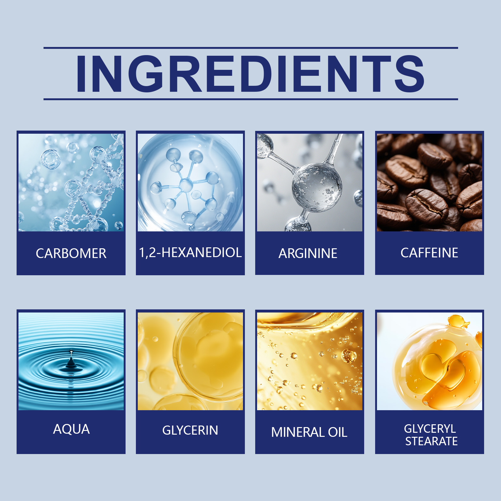 Ingredients: water, mineral oil, glycerol, glycerol stearate, 1,2- hexanediol, carbomer, arginine and caffeine.